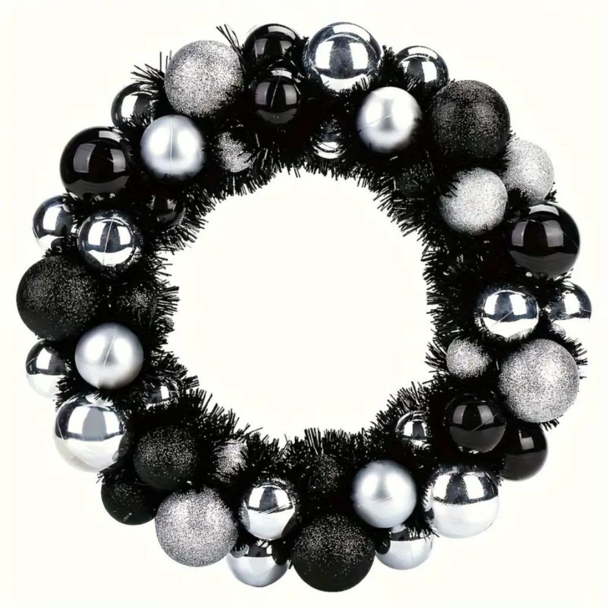 Moderner Weihnachtskranz Ø 33 cm in edlem Schwarz-Weiß. Hochglänzende Kugeln im Glam-Style setzen starke Kontraste und verleihen Eingängen, Wänden und Festtafeln eine zeitlos-elegante Note. Aus hochwertigem Kunststoff gefertigt: langlebig, formstabil, pflegeleicht – sofort dekorationsbereit.